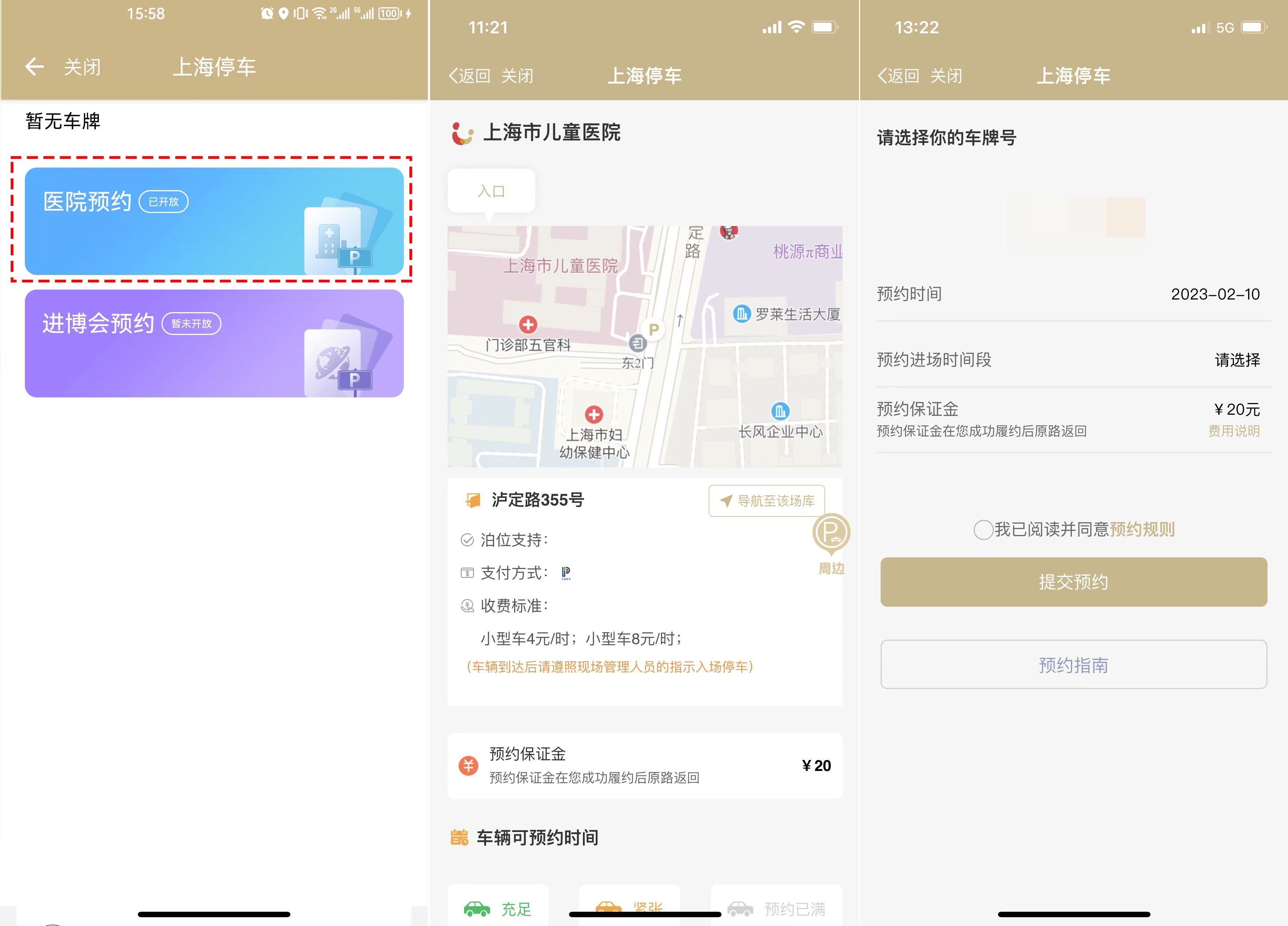为了快速找到医院,可在搜索框中输入关键字“儿童”→点击儿童医院的“普通预约”→选择停车日期和进场时间段后,点击“提交预约”→进入提交预约界面,显示预约成功后支付20元预约保证金(在成功履约后将原路返还),即可得到一个“预约二维码”