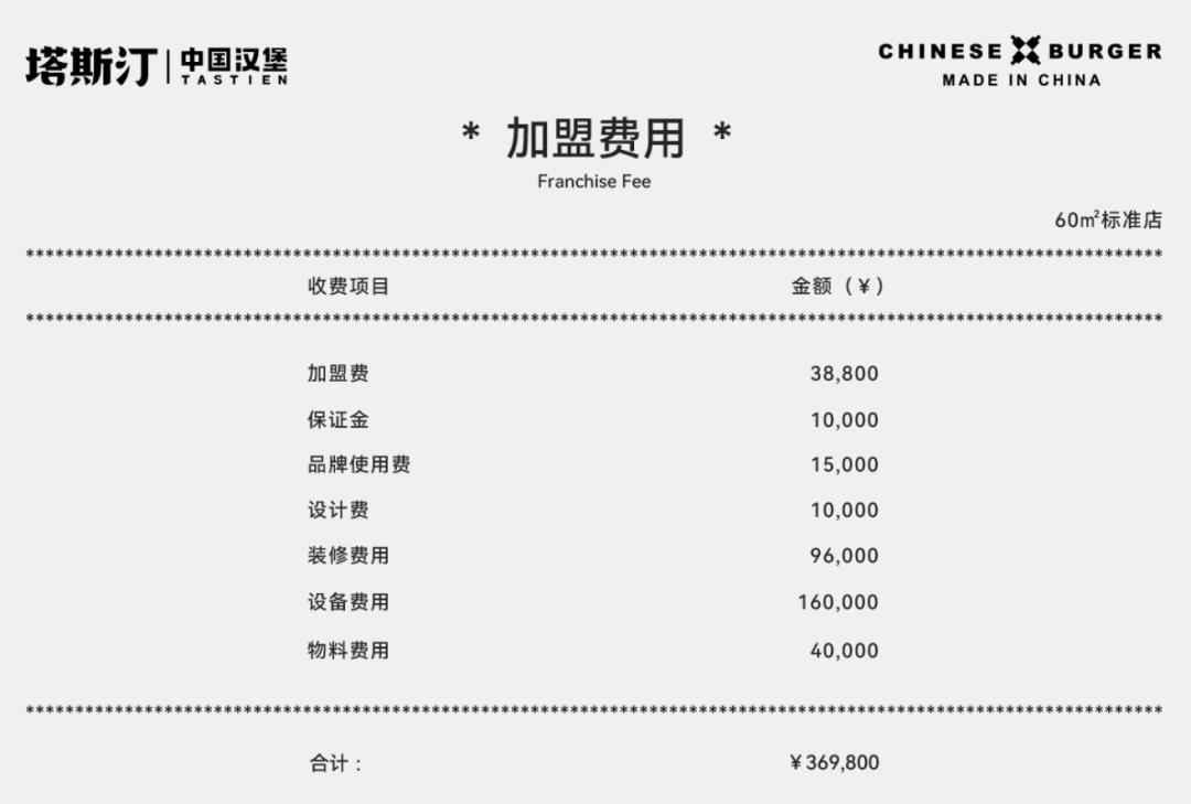 塔斯汀汉堡跟华莱士的人均消费差不多,但却有着更好的品质和别具一格的国潮风格,使得很多人想加盟大赚一笔。塔斯汀官网显示,想加盟年龄必须在20~35岁,且需要参与门店运营和培训,店面实际可用面积要大于等于60㎡,门头宽度要达到4.2m以上,还需要具备三相电、排烟、进水和排水。大概费用算下来为36.98万元。