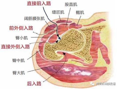 其次常用的入路是直接外侧入路,通过撕开臀中肌,剥离其前方1/3的肌肉止点,从髋关节的前上方进入。