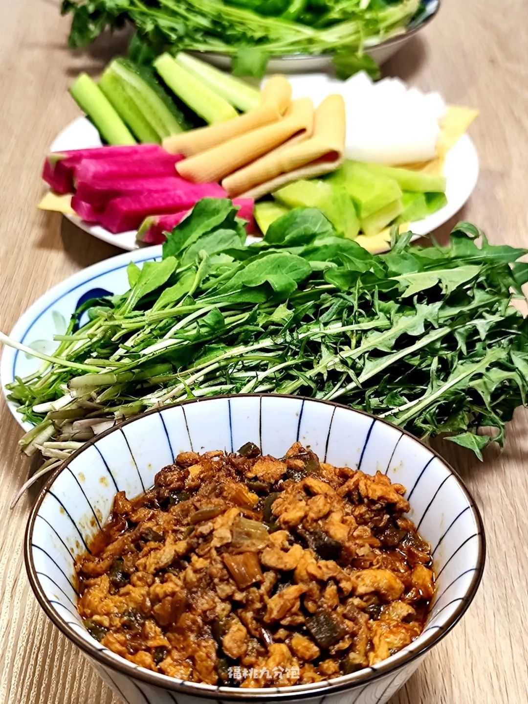 不像西式沙拉多数都是生菜、西兰花,鸡蛋酱蘸菜的可选性非常丰富。