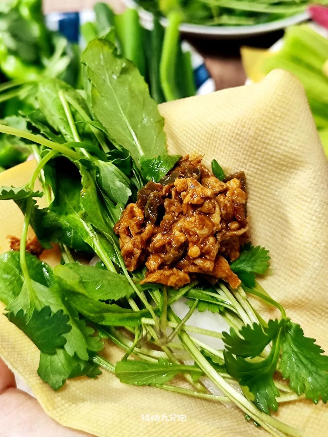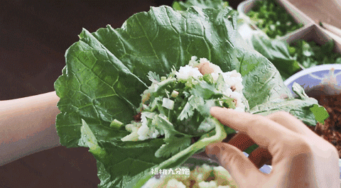 然后再用菜叶包起来,这样不仅每一口都咸淡均匀,也更容易包起来。
