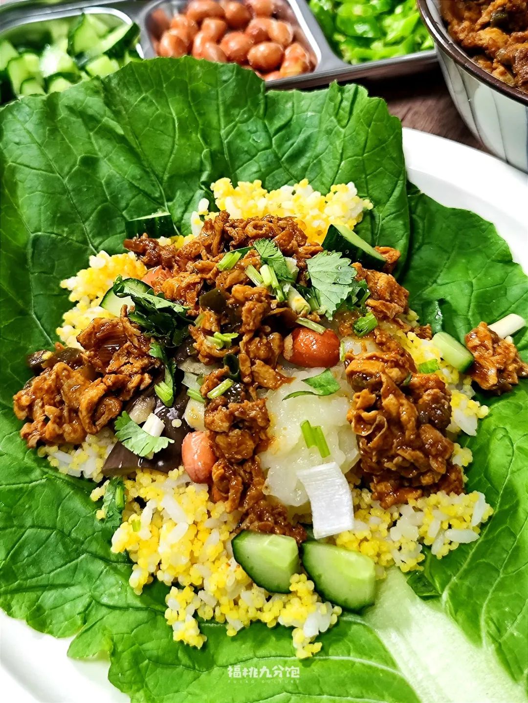 老手可以直接在菜叶里堆叠食材,最后的饭包刚好能包起来,不会太瘪也不会把菜叶撑破。