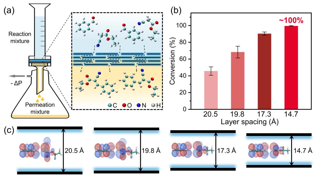 在温和条件下进行快速高效的流动反应是一个具有挑战性的课题。为此,张老师团队在文中报告了一种通过调控胺化氧化石墨烯膜层间距,实现在室温下快速高效的定向流动Knoevenagel缩合反应的策略。请问,您是如何想到调控层间间距来提高反应速率和转化率的?其中的反应原理是什么?相比其他方案有何优势?