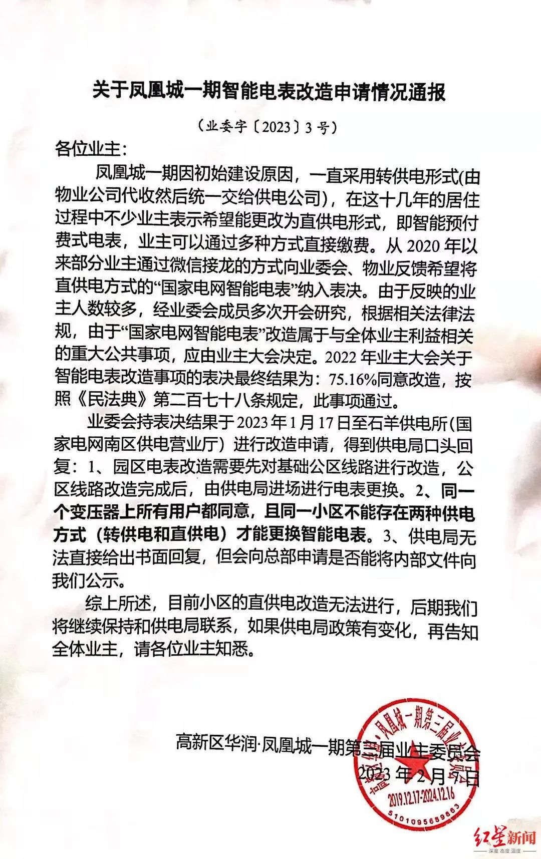 近日,小区业委会也对该事宜向小区业主进行了贴文通报。通报显示:“同一个变压器上所有用户都同意,且同一小区不能出现两种供电方式,才能更换智能电表。”