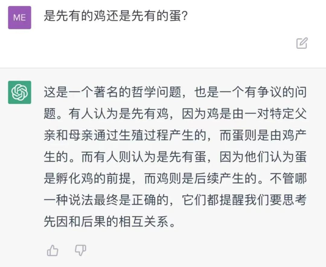还有的人,打算试试ChatGPT的智商(存疑,也许是测试情商),就给它提了一些经典困难问题,比如“鸡生蛋还是蛋生鸡”,比如“女朋友和妈妈同时掉水里”……