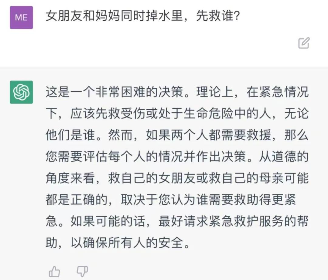 原标题:《女朋友和妈妈同时落水先救谁?人工智能ChatGPT给出了这样的答案……》