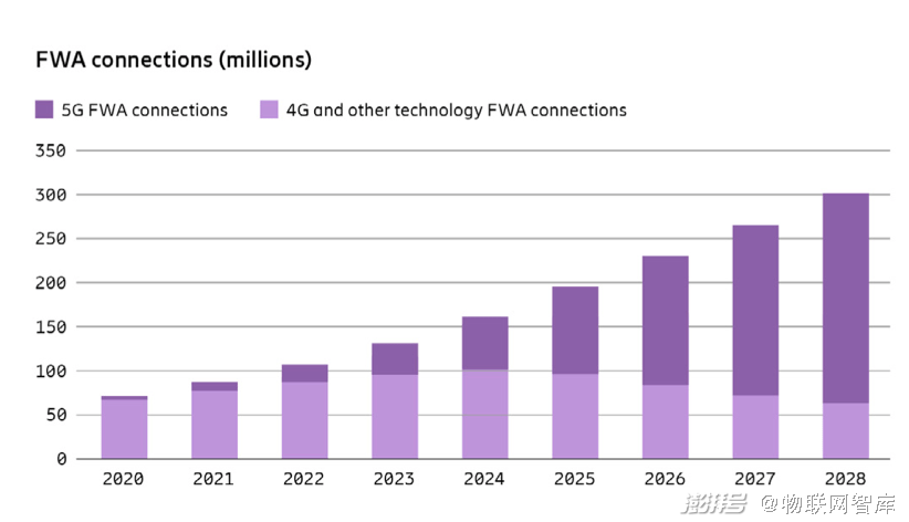 根据爱立信2022年11月刊《移动市场报告》的数据显示,在其调研的全球310家运营商中,有238家提供FWA服务,占比高达77%。截至去年底,全球FWA连接数超过1亿。到2028年,预计全球连接数将会增至3倍,达到3亿以上,而5G FWA 连接数预计到2028年将会达到2.35亿左右,占总连接数的80%。