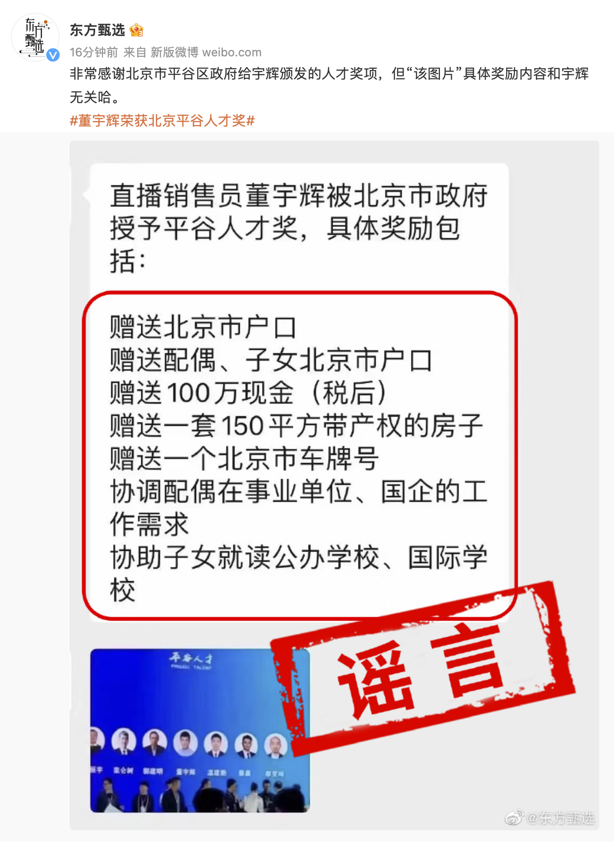 北京平谷区政府奖励百万现金+150平米住房?董宇辉否认