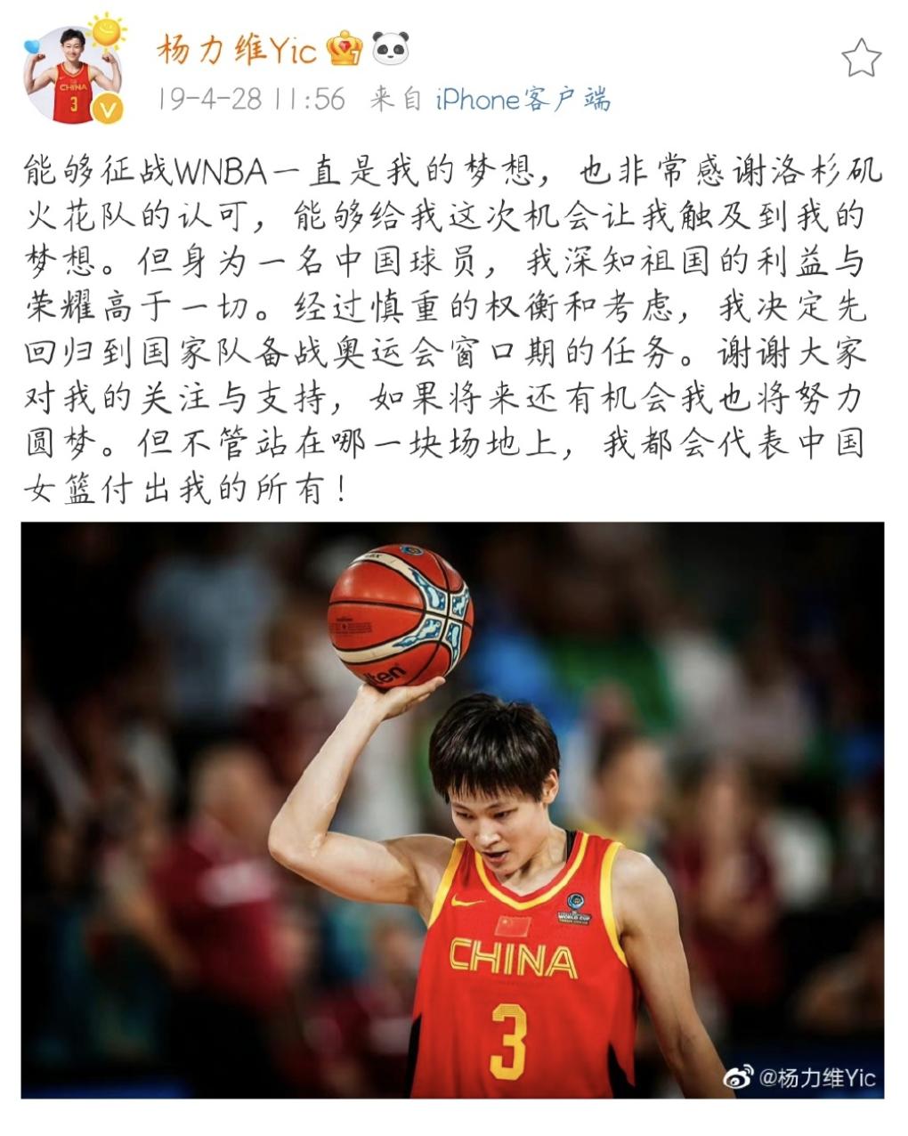 对于现年28岁的杨力维而言,如今收到来自于WNBA的邀请无疑有诸多感慨。因为早在四年前的2019年,同样是洛杉矶火花队就曾希望杨力维来到WNBA征战,在2018年帮助广东女篮夺得队史首座WCBA总冠军奖杯之后,杨力维与孙梦然、李梦以及韩旭都赴美前往WNBA球队试训,随即洛杉矶火花就将目光瞄住了擅长突破反击的杨力维。不过由于WNBA赛季将至少进行到九月,当时又正值备战东京奥运会的关键时刻,以国家队任务为主的杨力维毫无犹豫地选择将团队利益放在首位。虽然如此,但从杨力维此后在社交媒体的状态不难看出她的遗憾之情。