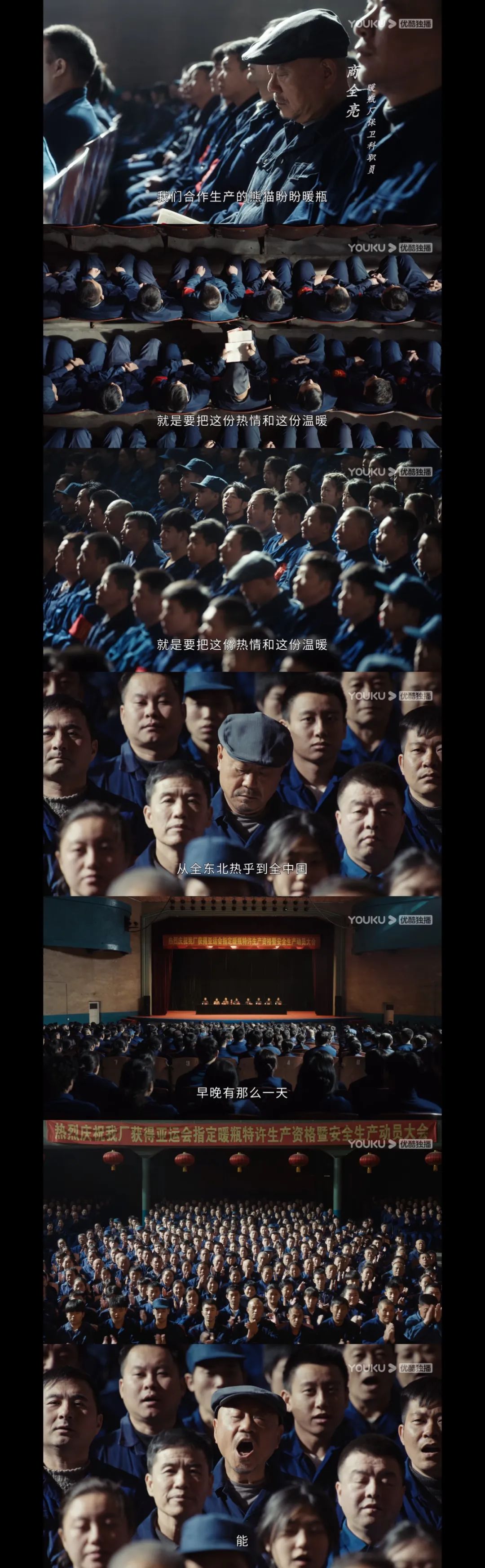 电影般镜头语言也承担了一定的叙事功能。查慕春坦言,“电影化的叙事节奏,很多东西不是靠台词,而是要靠画面和调度。”比如开头老商的出场。没有过多的台词介绍,仅以几个快速转换的镜头拼接,把90年代的社会背景、暖瓶厂的集体主义、老商的格格不入一一交代↓