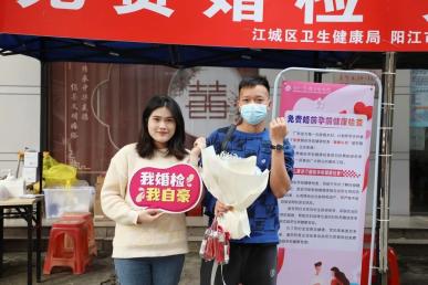 为贯彻落实省市政府统筹推进婚前保健工作的要求,履行出生缺陷干预中心的管理职责,推进免费婚前孕前保健工作,实现省、市妇女儿童发展规划(2021—2023年)目标任务,2月14日,我市婚前孕前健康检查定点服务机构阳江市妇幼保健院联合江城区卫生健康局、江城区妇幼保健计划生育服务中心在江城区婚姻登记处开展以“免费婚检,见证幸福”为主题的免费婚前孕前健康检查及宣传咨询活动,在见证每一对新人幸福时刻的同时,为爱把关,为爱护航。