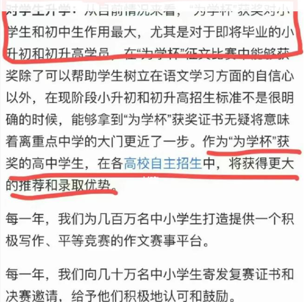 “三大写作赛事之一,‘为学杯’征稿中。”一家社交平台上,有人发布这样的比赛广告,引得不少家长跟帖咨询如何参赛。广告中,宣称“为学杯”作文大赛和“叶圣陶杯”“冰心杯”齐名,属于“国家级”写作赛事。而当询问是否还能报名“叶圣陶杯”作文比赛时,其表示已于2月16日截止了。