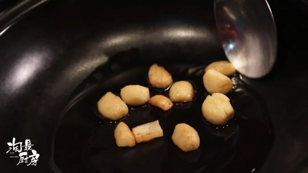 ❷ 热锅内加1调羹(15ml)油和5颗大蒜,炒出香味。