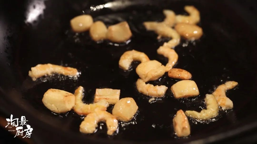 ❸ 增鲜!再倒入10g虾干,翻炒。