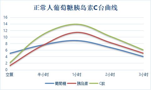 正常人的葡萄糖、胰岛素、C肽曲线图,数值基本同步。(如图↓)