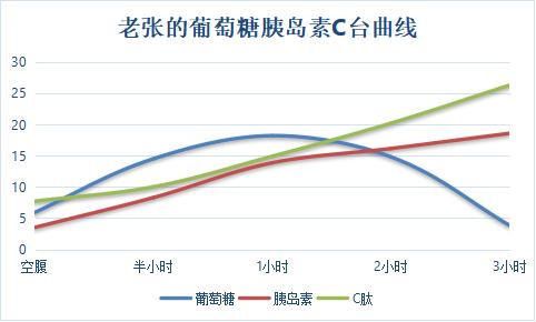 而像老张这样的2型糖尿病患者,葡萄糖、胰岛素、C肽曲线走向是分离的(如下图↓)。餐后三小时血糖低,胰岛素、C肽达高峰。