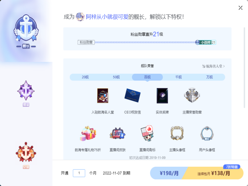 舰长的价格是每月198元,连续包月是138元,但钱并不会直接打给主播,而要经过B站平台的50%抽成。(此处是个人势的情况,如果加入公会,分成比例根据公会的签约合同而定)如果观众用ios手机端为主播充值,ios端会先抽取30%的礼物钱;如果主播一次提现超过800元,还需缴纳20%的个人所得税。