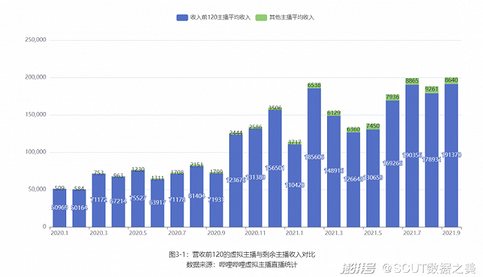 澎湃SCUT数据之美2022年5月的发稿显示,B站的3606名虚拟主播中,收入低在主播中是一个极为普遍的现象。B站虚拟主播的月营收排行榜中,排名在前120的虚拟主播营收就占据了整个行业总营收的一半以上,而其余主播的平均月营收仅为前120的虚拟主播月营收的1%到5%。