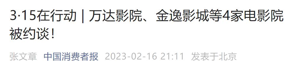 据报道,2月14日,福建省福州市消费者权益保护委员会集体约谈4家涉嫌侵犯消费者权益的电影院,涉及万达影院、金逸影城、几何影城、福州苏宁影城。