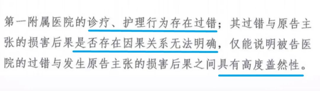 法院查明生殖中心的诊疗、护理行为存在过错,过错与“不是亲生”是否存在因果关系无法明确,仅能说明过错与“不是亲生”之间具有高度盖然性。判决书载明高度盖然性即极大可能性。