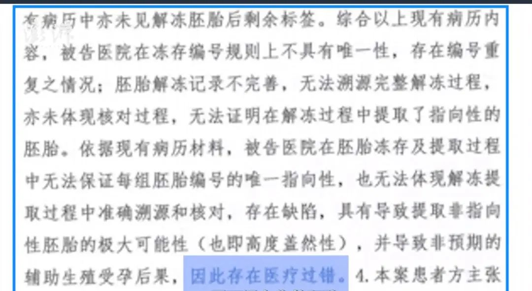 他表示,精子卵子同时出错的概率比较小,如果女方没有的话,也就是当时复苏解冻的时候搞错了,“这个可能是胚胎搞错了”。一般来讲,在移植胚胎环节出错的话,不会只错一个,至少错两个。