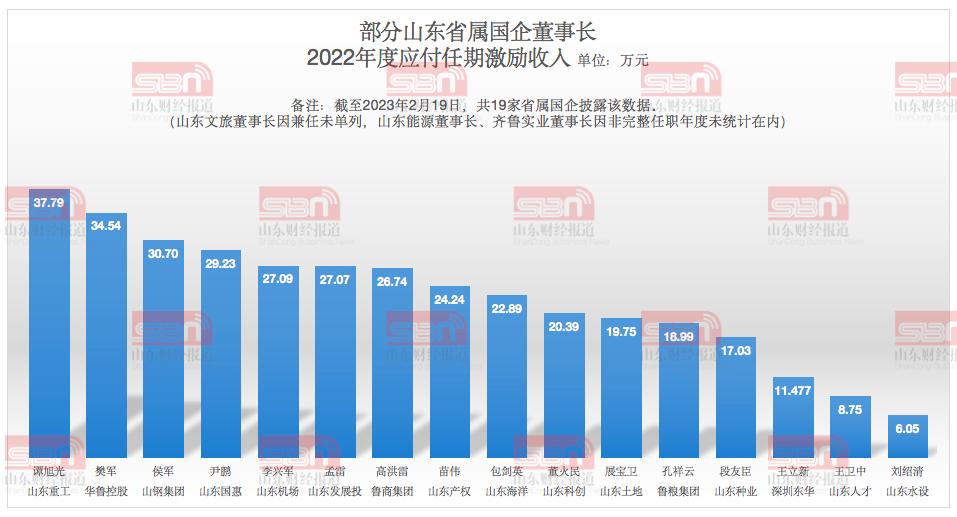 经济导报记者观察到,从山东省属国企“一把手”来看,2022年度应获任期激励收入最高的是山东重工董事长谭旭光(37.79万元)。2022年度应获任期激励收入超过30万元的还有华鲁控股董事长樊军(34.54万元)、山钢集团董事长侯军(30.70万元)。03