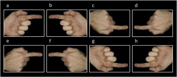 LRD试验包含八次刺激,其中a和b是以自我为中心,看待自己手的方式;其余六张图则需要参与者旋转到以自我为中心的位置来识别左右手|参考文献[6]那为什么我们会混淆左和右呢?