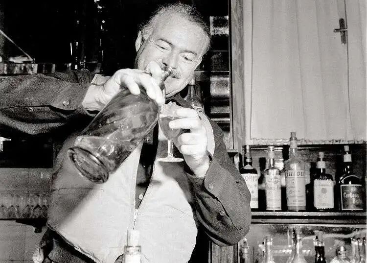 海明威这句名言,完美体现了他在写作与喝酒上所追求的“硬汉”形象。海明威就像他笔下的人物一样喝个不停,在《太阳照常升起》中,杰克·巴恩斯和布雷特·阿什利午饭前喝了3杯马提尼,还喝了5-6瓶红葡萄酒。几乎他的所有文字都洋溢着酒气,但最明显的还是在两本后期的作品里《渡河入林》和《流动的盛宴》。