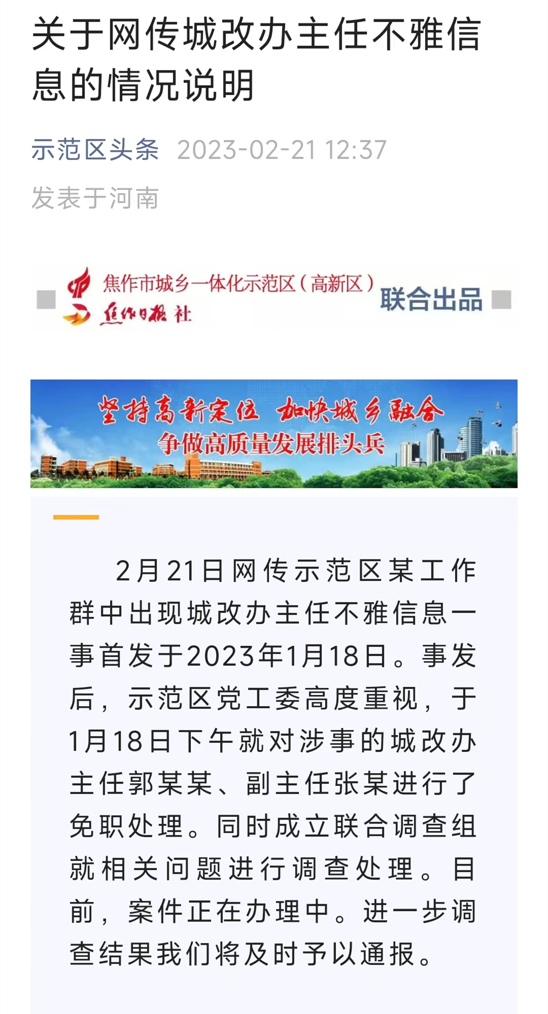 2月21日中午,河南焦作市城乡一体化示范区(高新区)通过其官方微信公众号“示范区头条”发布关于《关于网传城改办主任不雅信息的情况说明》: