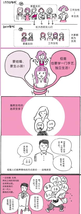 在《从零开始的女性主义》一书里,漫画家田中画了这样一幅漫画:在一个教育女性独立和育儿两手抓的新世界里,成为平衡工作和事业的「完美母亲」。社会为女性加了越来越多的枷锁,但是社会教育男性的方式却没有变。
