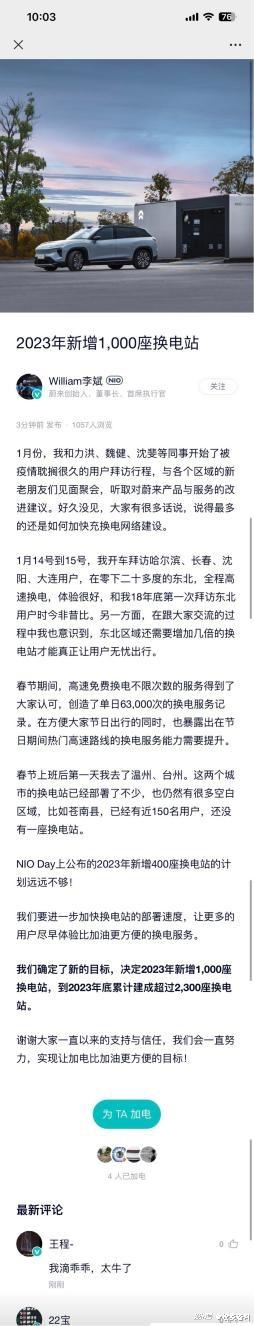2月21日,蔚来创始人、董事长、首席执行官李斌发布消息称,蔚来汽车确定新的目标,决定2023年新增1000座换电站,到2023年底累计建成超过2300座换电站。