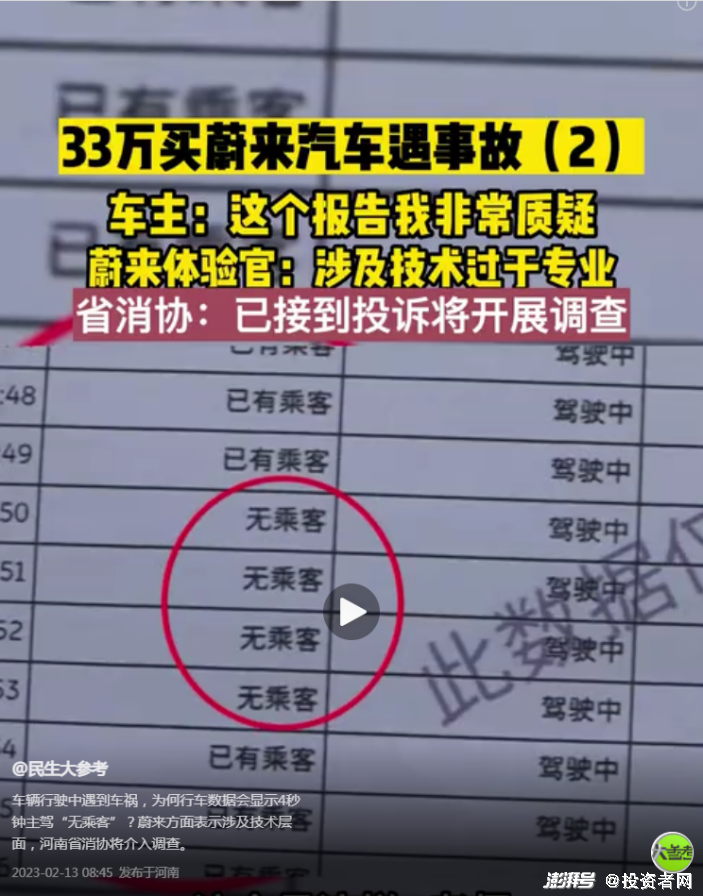 据民生大参考今年2月披露,消费者以33万元购买蔚来汽车,车辆行驶中遇车祸,蔚来出具的报告却显示“行驶中”的同时,“无乘客”标注,这也引发消费者对蔚来篡改数据的质疑。蔚来方面表示“涉及技术层面”,而河南省消费者协会称“已接到投诉,将开展调查”。