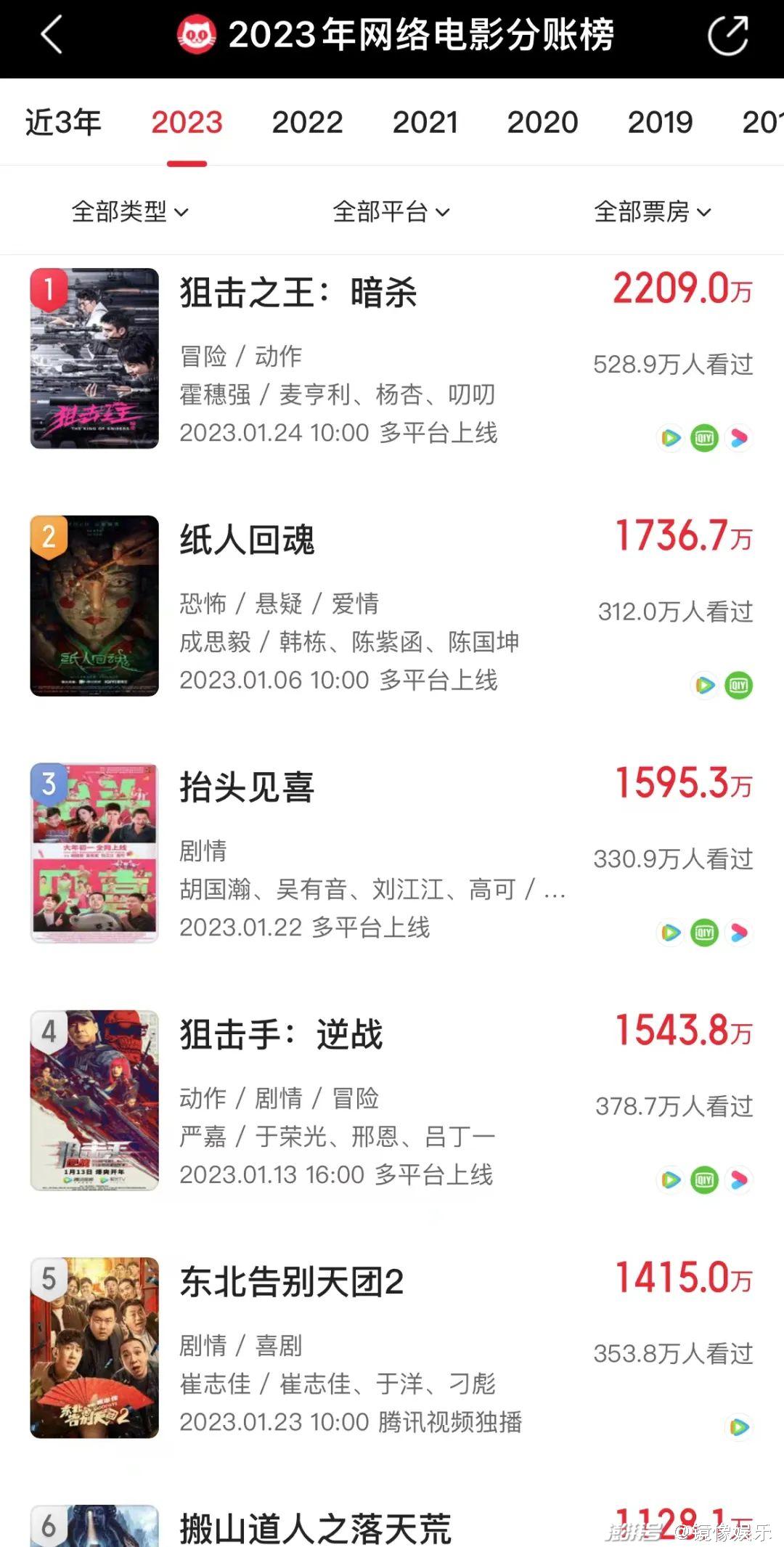 截至目前,2023年已有《狙击之王:暗杀》《纸人回魂》《抬头见喜》《狙击手:逆战》《东北告别天团2》《搬山道人之落天荒》六部影片分账票房破千万,其中《狙击之王:暗杀》是唯一一部分账破2000万的。这一成绩相较去年稍显逊色,2022年同期,《龙云镇怪谈》《我不是酒神》等八部影片进入了千万分账行列。