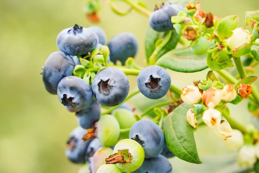 蓝莓花飘香四溢、洁白透亮圆圆的、鼓鼓的