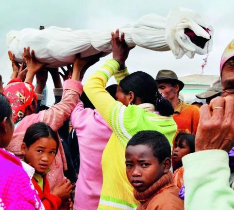 马达加斯加位于非洲东部,是非洲最大的岛国,同时也是世界第四大岛。它有独特的语言、信仰和文化。2008年播出的动画片《马达加斯加的企鹅》为观众构造了一个奇妙的动物世界,于是一提到马达加斯加,人们就会联想到此动画片。除此之外,最让人们好奇的莫过于一种与众不同的马达加斯加传统习俗——翻尸节(famadihana)。当地人将逝去的亲人的尸体移出坟墓,换上或裹上新的裹尸布,举行载歌载舞的仪式后再移回祖坟。翻尸节其实是马达加斯加人祭拜祖先的方式之一,其文化内核是祖先崇拜,即把祖先当作“神”,它体现的是马达加斯加传统文化中生与死之间、生者与死者(祖先)之间的相互关系:生者照顾死者,给他们换新的裹尸布,将葬在别处的死者移回祖坟,对死者负责;而死者则通过仪式祝福、保佑、指导生者,也对生者负责。