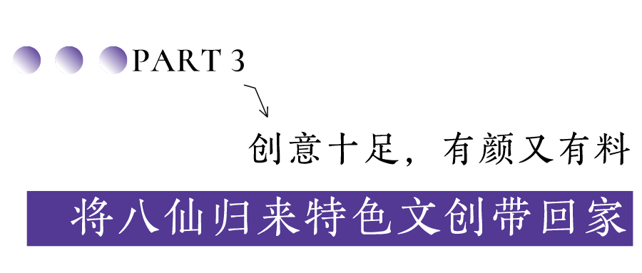 在这里,走走停停,挑挑看看,从密密麻麻的各种八仙文创中,总能寻得一两个喜欢的文创产品,不光能够满足买买买的欲望,更能够品味满满的八仙文化。