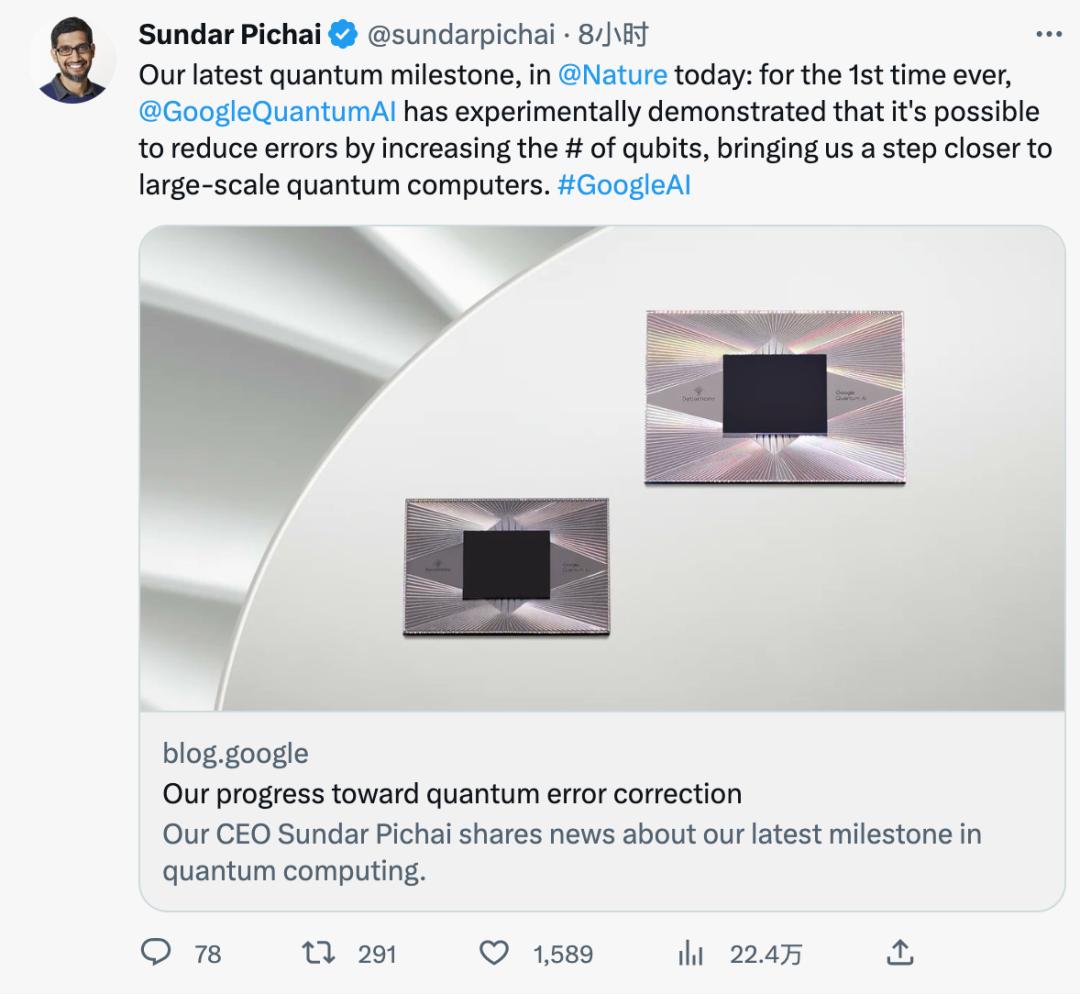 编辑:杜伟、蛋酱谷歌 CEO 皮查伊表示,「这项新突破让我们离大规模量子计算机更近了一步。」