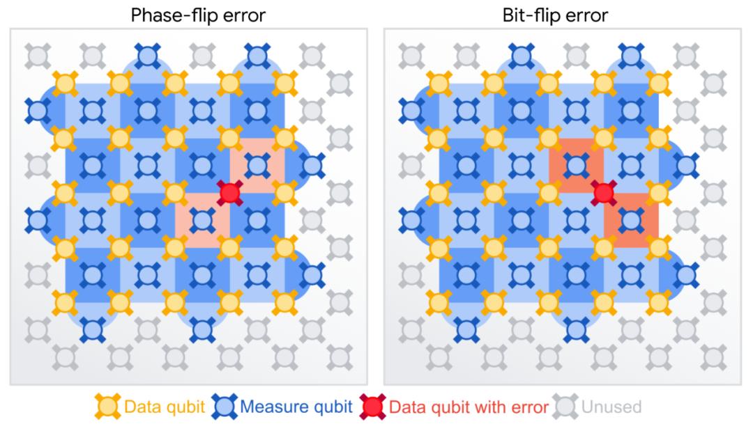 谷歌在棋盘图案上平铺了两类稳定器测量值,以保护逻辑数据不受比特和相位翻转的影响。如果一些稳定器测量值记录下了错误,则使用它们中的相关性来确定发生以及在什么地方发生了哪些错误。