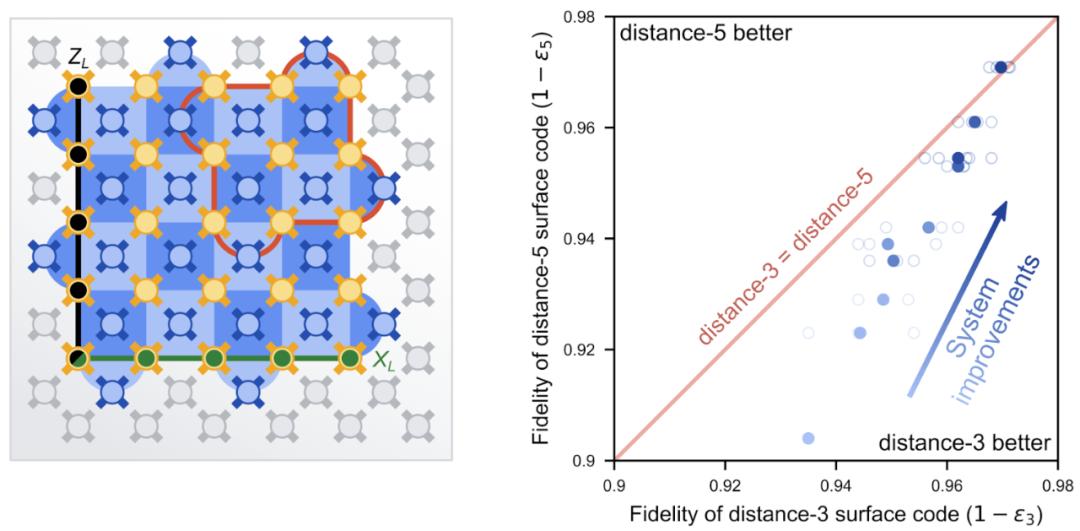 实验结果如上图右侧所示,几个月来的持续改进减少了两个网格的逻辑错误,导致距离 - 5 网格(ε_5=2.914%)在 5��置信度下比距离 - 3 网格(ε_3=3.028%)高出 4%(��_3,5=1.04)。这似乎是一个小的改进,但重要的是,这个结果代表了自 1995 年 Peter Shor 提出 QEC 建议以来的领域内「首次」。较大的代码优于较小的代码是 QEC 的一个关键特征,所有的量子计算架构都需要通过这一障碍,以实现量子应用所需的低误差。未来展望