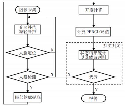 PERCLOS的获取办法是车内摄像头对人脸进行图像采集,随后将图像传递至控制器。控制器利用预先导入的人脸识别算法对动态视频进行逐帧识别,判断哪些帧是眼皮盖过眼球的面积超过预设的比例。最后,统计疲劳帧数,和该段时间总帧数相除,得出结果。