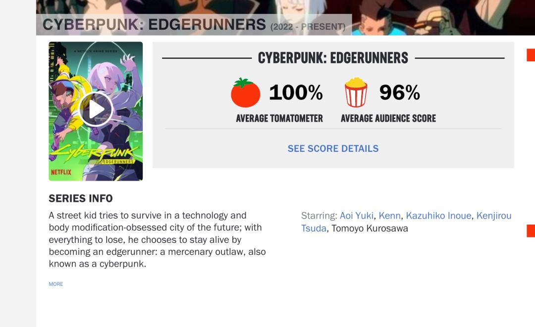 上线之后《边缘行者》凭借优秀的改编细节,以及优秀的剧情叙事收获满场好评:豆瓣评分为 9.3 分,在烂番茄甚至拿到了 100% 的专业观众评分。