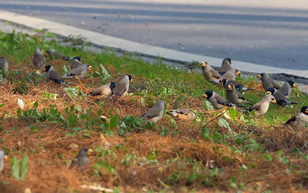 图/中国科学院武汉植物园在植物园观鸟平台可以看到白头鹎相伴觅食、灰喜鹊在草地上闲庭信步。