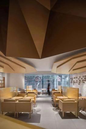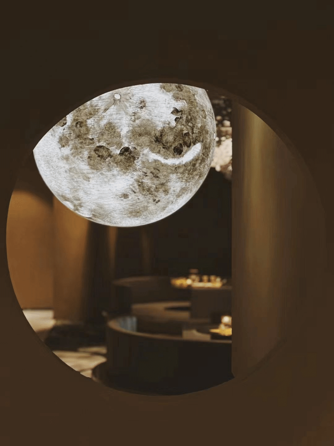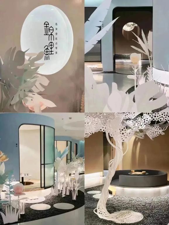 色彩鲜明的折纸风花草树木分布在不同的茶室之间,深处的巨型月球充满梦幻科技感,空间的神仙颜值很有仙侠世界的氛围,随手一拍就是大片。