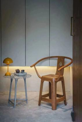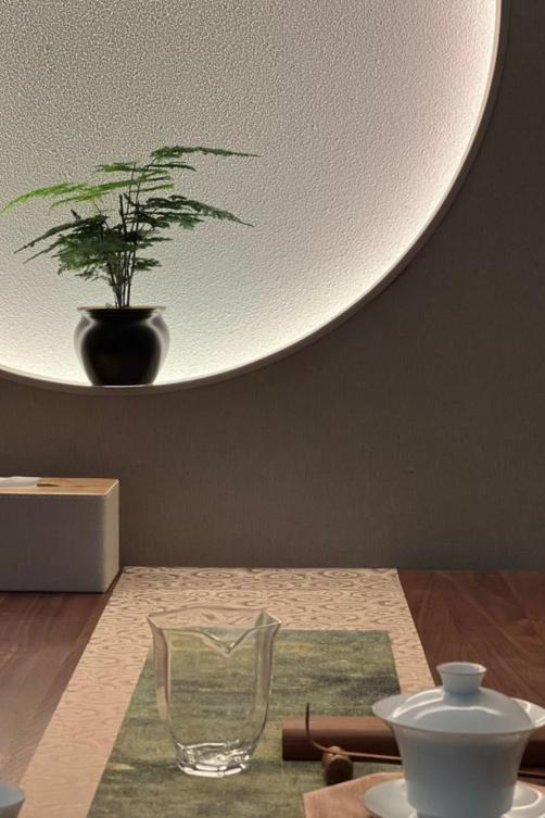 茶室是极简素雅风格,禅意十足的木调加入简单的装饰点缀就极有氛围感了。玻璃房及不锈钢水波纹打造的“曲水流觞”,让整个空间灵动起来。
