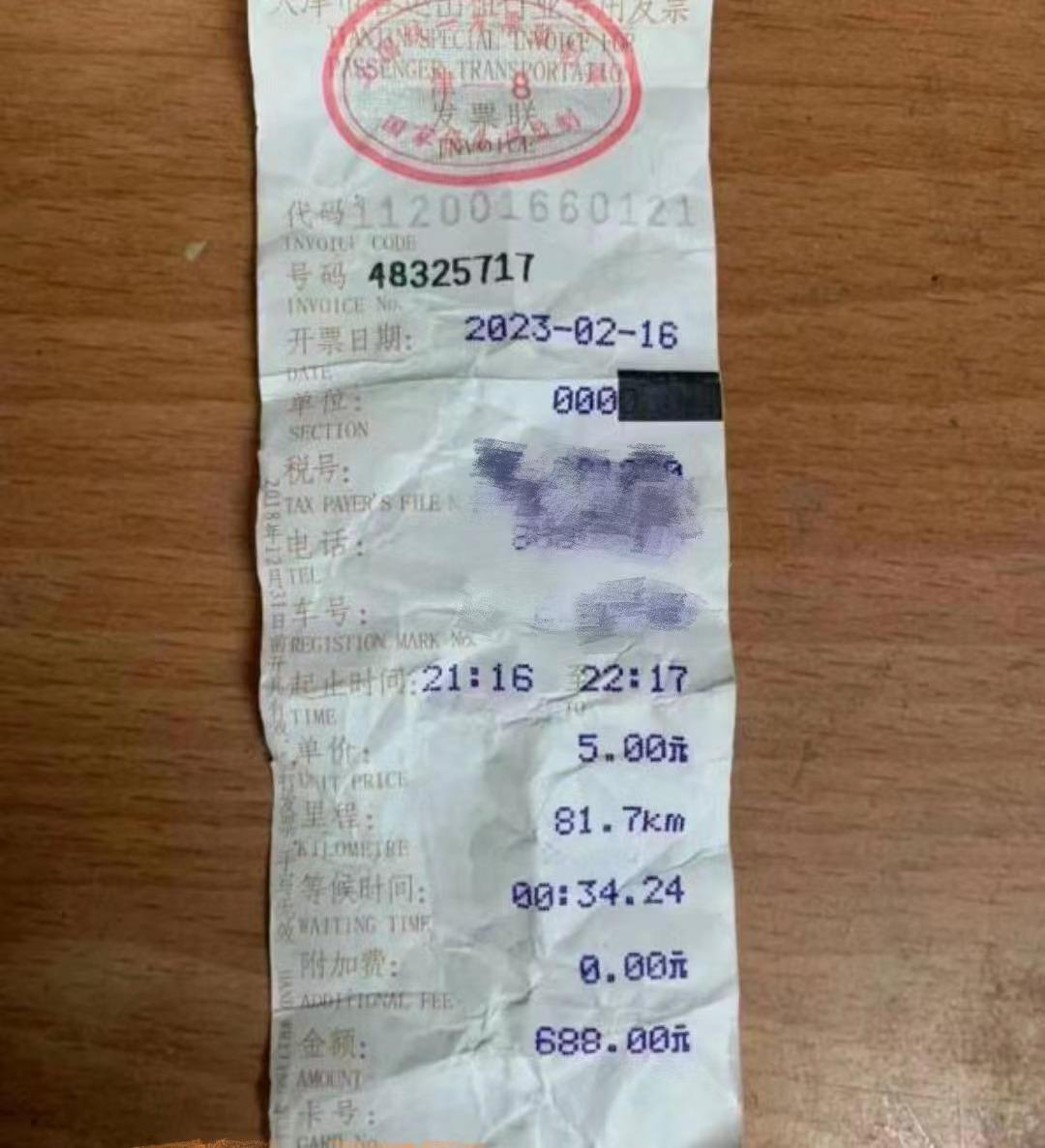 ▲688元的打车票听了这番解释,李先生一时脑子嗡嗡作响,由于是只身一人来津,无奈之下只好通过手机支付了车款,并索要了打车发票。“下车后,我越看这张票越觉得不对劲,运营单价是5元,等候时间34分钟。”小李拿着票诉说着自己的疑问,“我是晚上9点多上的车,10点多到的大学,一路顺畅,没有拥堵,哪来的34分钟等候时间?”
