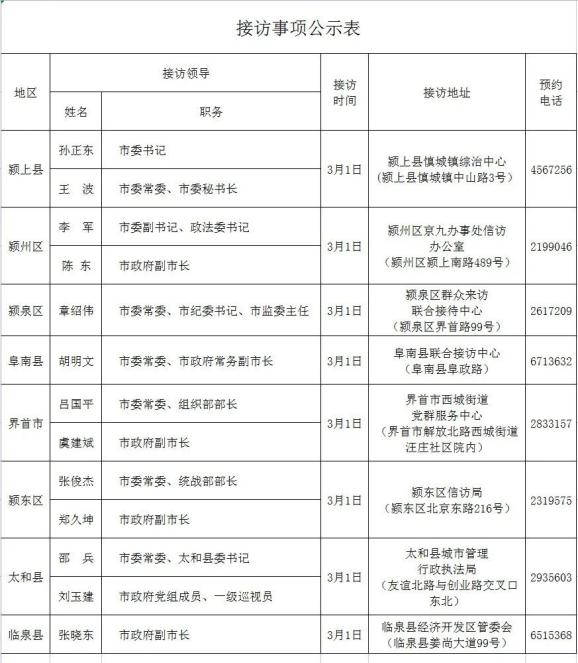 根据工作安排,市党政领导定于2023年3月1日(星期三)在各县(市、区)开展公开接访,上午9:00开始。