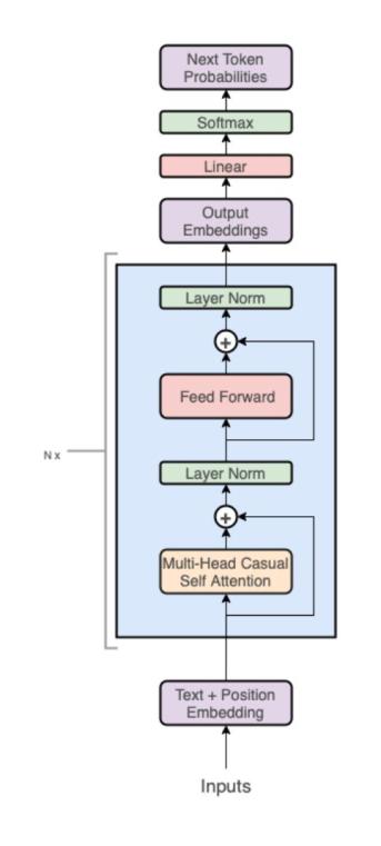 需要注意,由于摆脱了编码器,中间的交叉注意力层也被删除了。在高层次上,GPT 体系架构有以下三个部分: