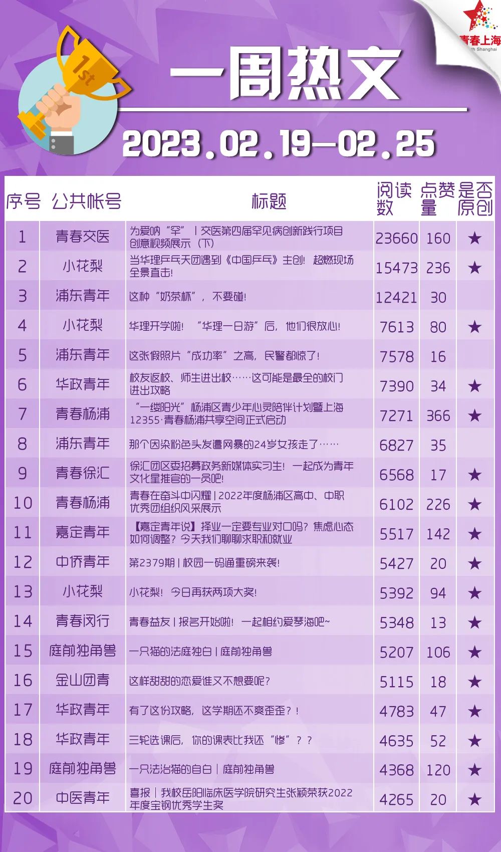 ☆ 砥砺前行,青春在奋斗中绽放!青春徐汇发布的《徐汇团区委招募政务新媒体实习生!一起成为青年文化星推官的一员吧!》,发出邀请,一起成为青年文化星推官。嘉定青年发布《【嘉定青年说】择业一定要专业对口吗?焦虑心态如何调整?今天我们聊聊求职和就业》,解答求职和就业问题,优秀青年为嘉定发展建言献策。中医青年发布《喜报|我校岳阳临床医学院研究生张颖荣获2022年度宝钢优秀学生奖》,彰显优秀青年热血与担当。青春交医发布《为爱呐“罕”丨交医第四届罕见病创新践行项目创意视频展示(下)》,提高交医青年对罕见病的认知和关注。青春杨浦发布《青春在奋斗中闪耀 | 2022年度杨浦区高中、中职优秀团组织风采展示》,让青春在奋斗中绽放绚丽之花。