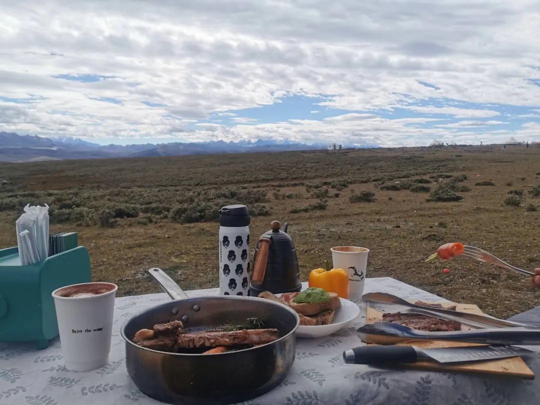 高原气压低,意式制作困难,烧壶开水做手冲,伴着眼前宏大自然景观,人在其中变得渺小,没有优质睡眠的夜晚也在记忆中被描绘成有趣的往事。呼朋唤友出门,
