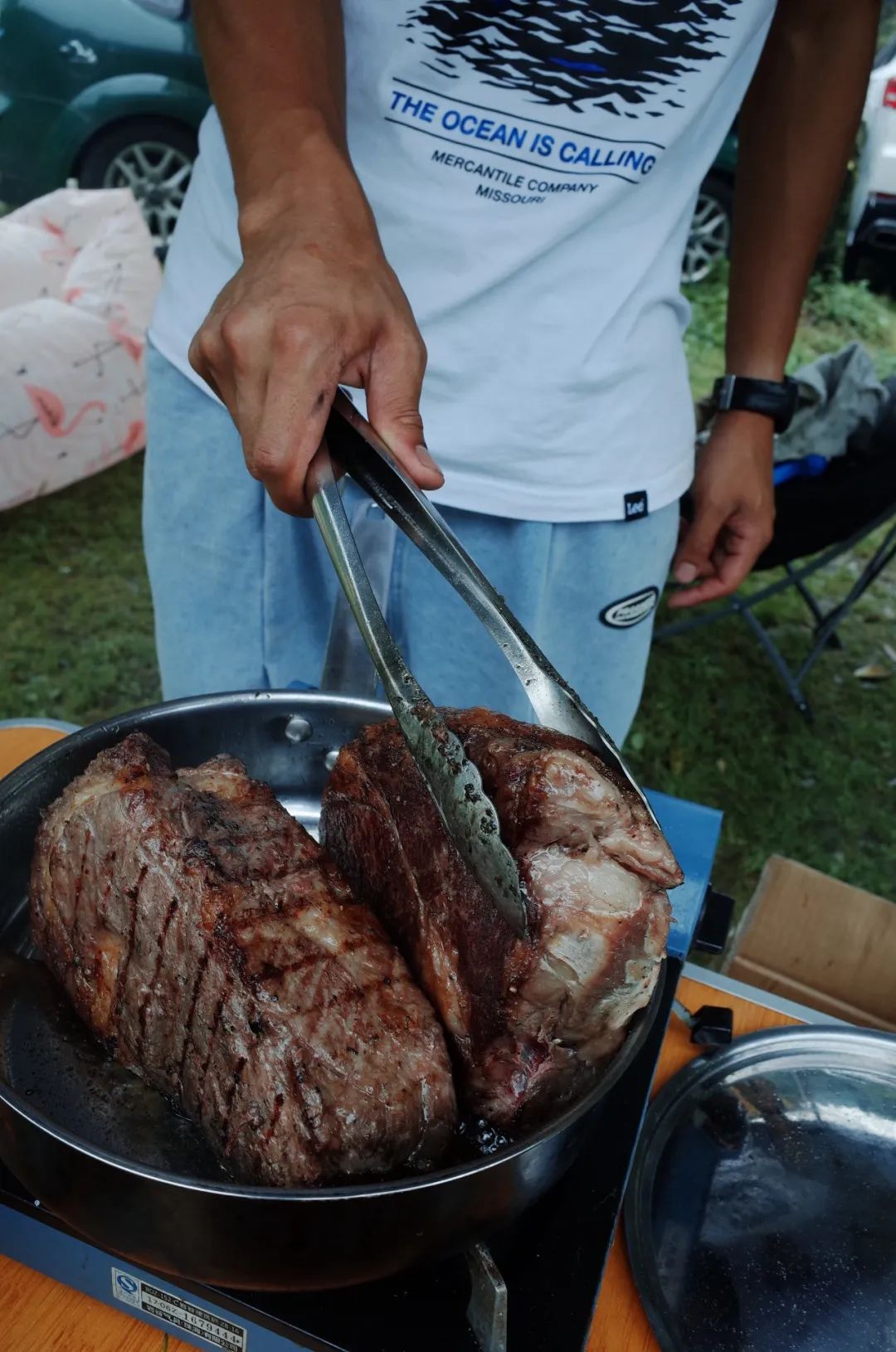 有西厨经验的@xx 提前买好了M4牛肉,水果啤酒和西瓜,甚至还带了小龙虾,装备齐全中不乏大铁锅、蜂窝煤炉和烧烤架,沉重但迈着轻快的步伐。和好友们共同攒的局,吃的喝的比在城里还好。